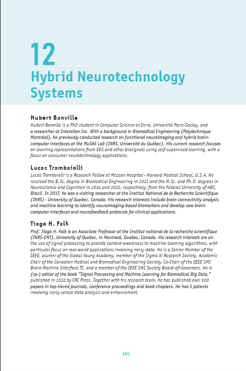 Banville HJ*, Trambaiolli LR*, Falk TH. (2021). In: Swaine-Simon, S. et al. (Org.) The Neurotech Primer: a beginner’s guide to everything neurotechnology, 1ed.: NeuroTechX, 165-178.