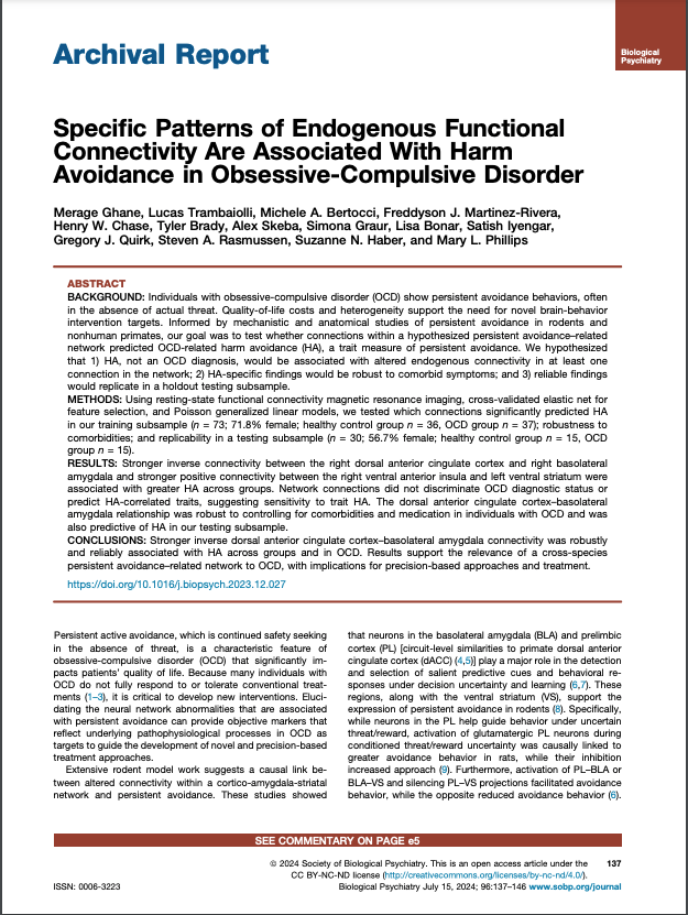 Ghane M, Trambaiolli L, Bertocci M, Chase H, Brady T, Skeba A, Graur S, Bonar L, Iyengar S, Quirk G, Rasmussen S, Haber S, Phillips ML. (2024). Biol. Psychiatry. 96(2):137-146. DOI: 10.1016/j.biopsych.2023.12.027